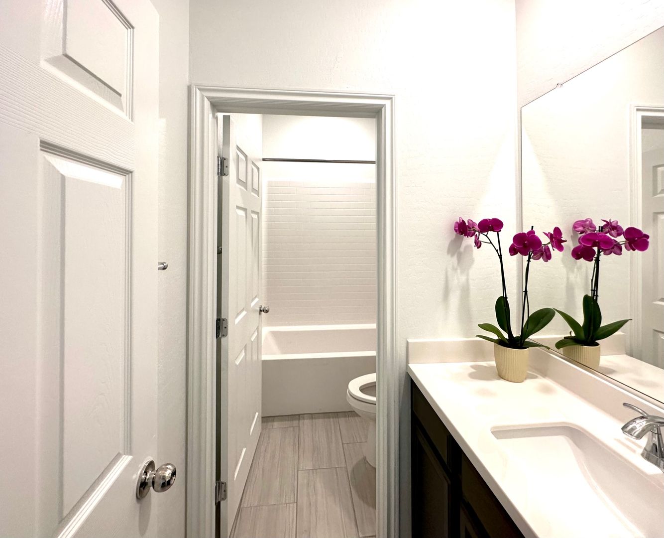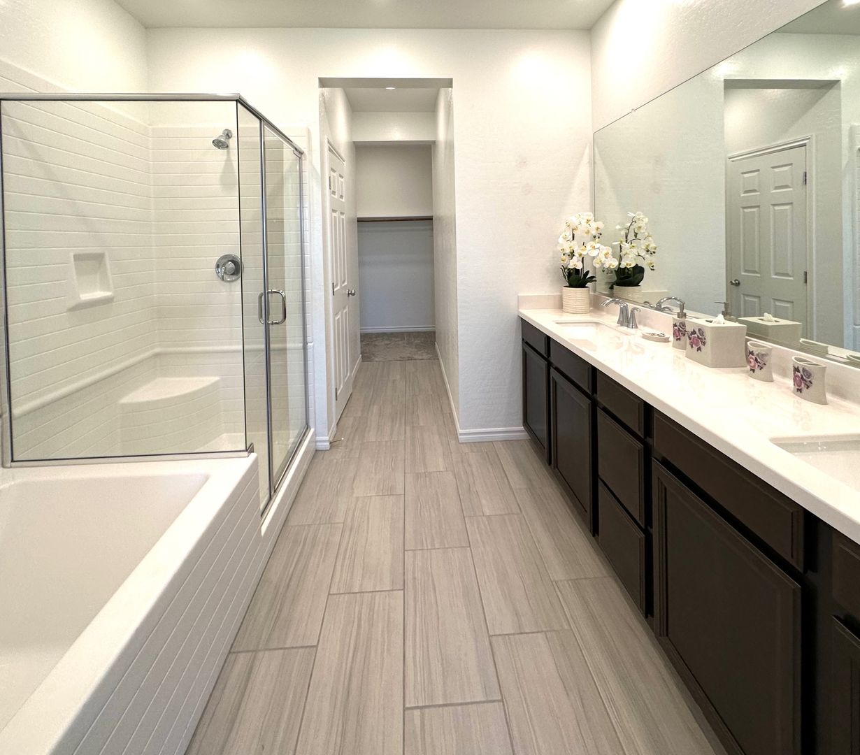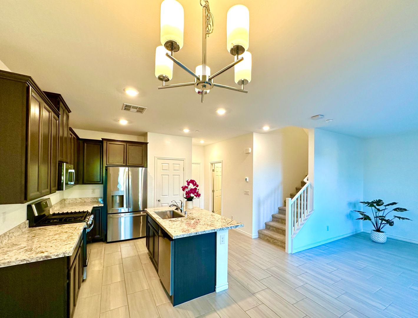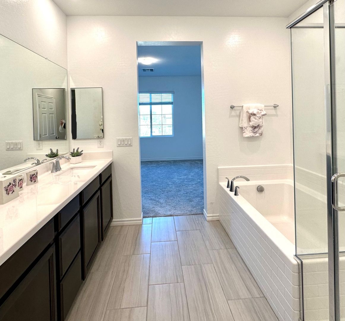 Welcome to this stunning 3-bedroom, 2.5-bathroom, 2-story home located off Las Vegas Blvd. This upgraded property is nestled within a gated community that boasts a refreshing community pool. The home features a spacious 2-car garage and a covered patio, perfect for enjoying the Nevada weather. Inside, you'll find a well-appointed kitchen complete with a pantry, an island, stainless steel appliances, and sleek quartz countertops. The downstairs area is adorned with durable tile flooring, while the second floor is carpeted for comfort. The primary bedroom is a true retreat, featuring a walk-in closet and an en-suite bathroom with a garden tub and separate shower. Experience the perfect blend of luxury and convenience in this Las Vegas gem. Contact us today for a showing!